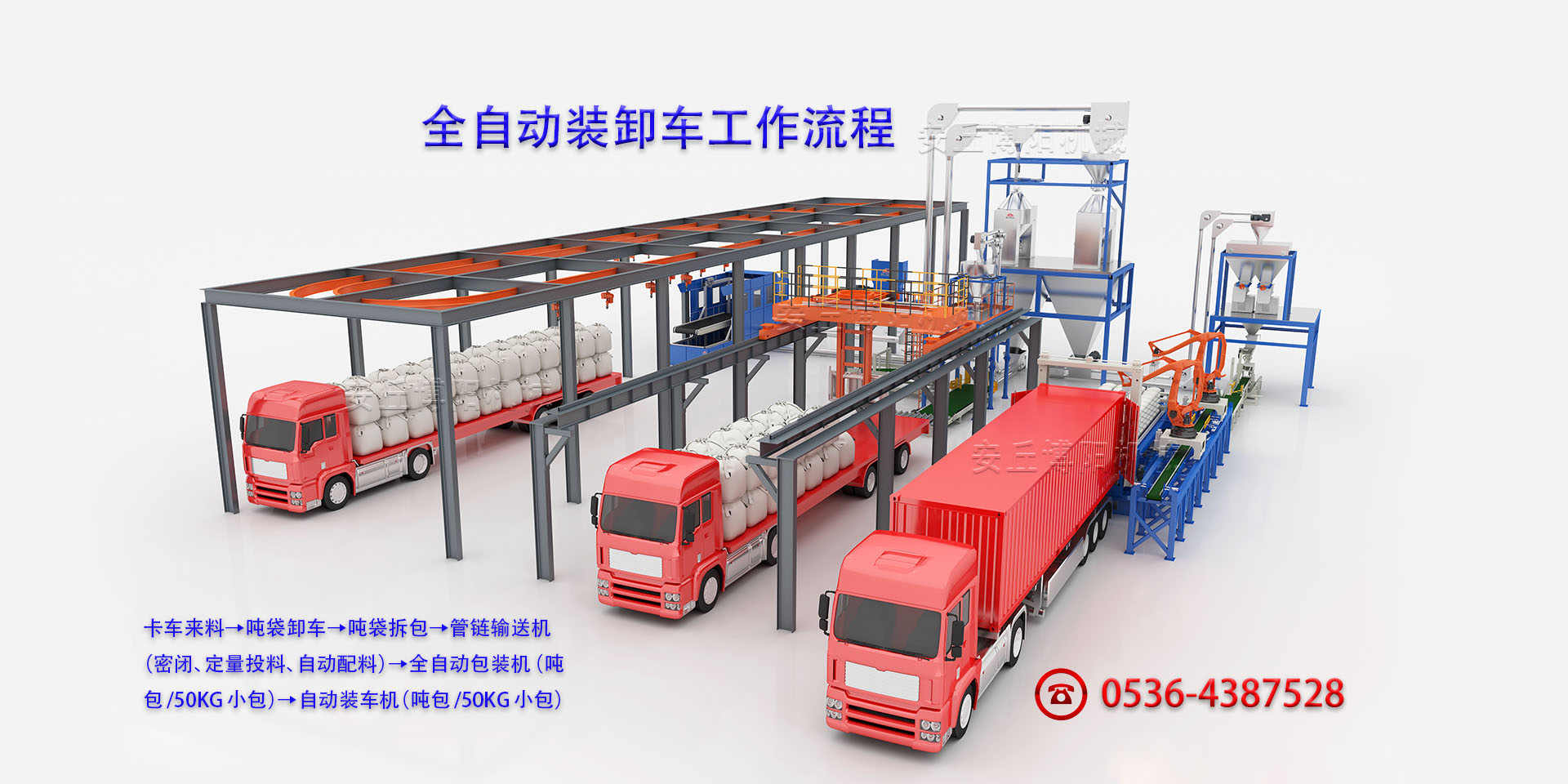 自動配料投料系統→全自動包裝機→碼垛機器人→AGV出入庫系統→自動裝車機生產線